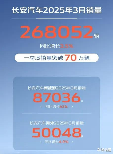 日前长安汽车发布销量快报,3月份其销量268052辆,同比增长3.5%。其中,自主品牌销量23.3万辆,自主乘用车销量16.57万辆,海外销量4.96万辆,新能源3月销量8.72万辆。