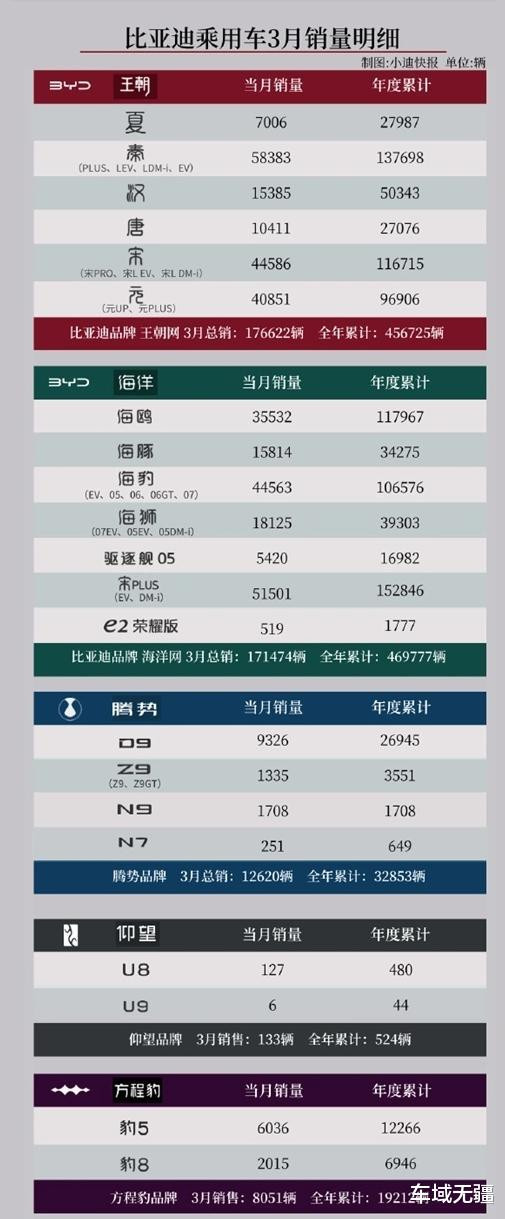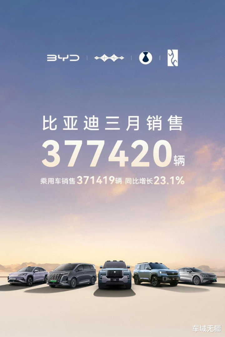 近日,比亚迪公布了3月份的销量数据,达到了377420辆,同比增长了24.8%。其中,乘用车销售371419辆,同比增长23.1%。