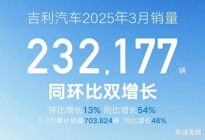近日,吉利汽车公布了3月份销量成绩,共计售出新车232177辆,同比增长54%,环比增长13%,持续实现了双增,1~3月累计销量达到703824辆,同比增长48%。
