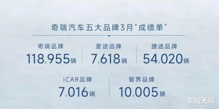 分品牌来看,奇瑞集团的两大销量主力是奇瑞品牌和捷途品牌,3月销量分别为118955台和54020台。而星途品牌3月份销售汽车7,618辆,iCAR品牌3月份销售汽车7,016辆;智界品牌3月份销售汽车10,005辆。