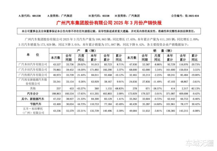 根据广汽集团公布数据显示,3 月汽车销量为 17.39 万辆,同比下降 3.01%。其中广汽埃安(含昊铂)月销量为24656辆,同比下滑11.49%;广汽传祺月销量为32465辆,同比下降2.25%。